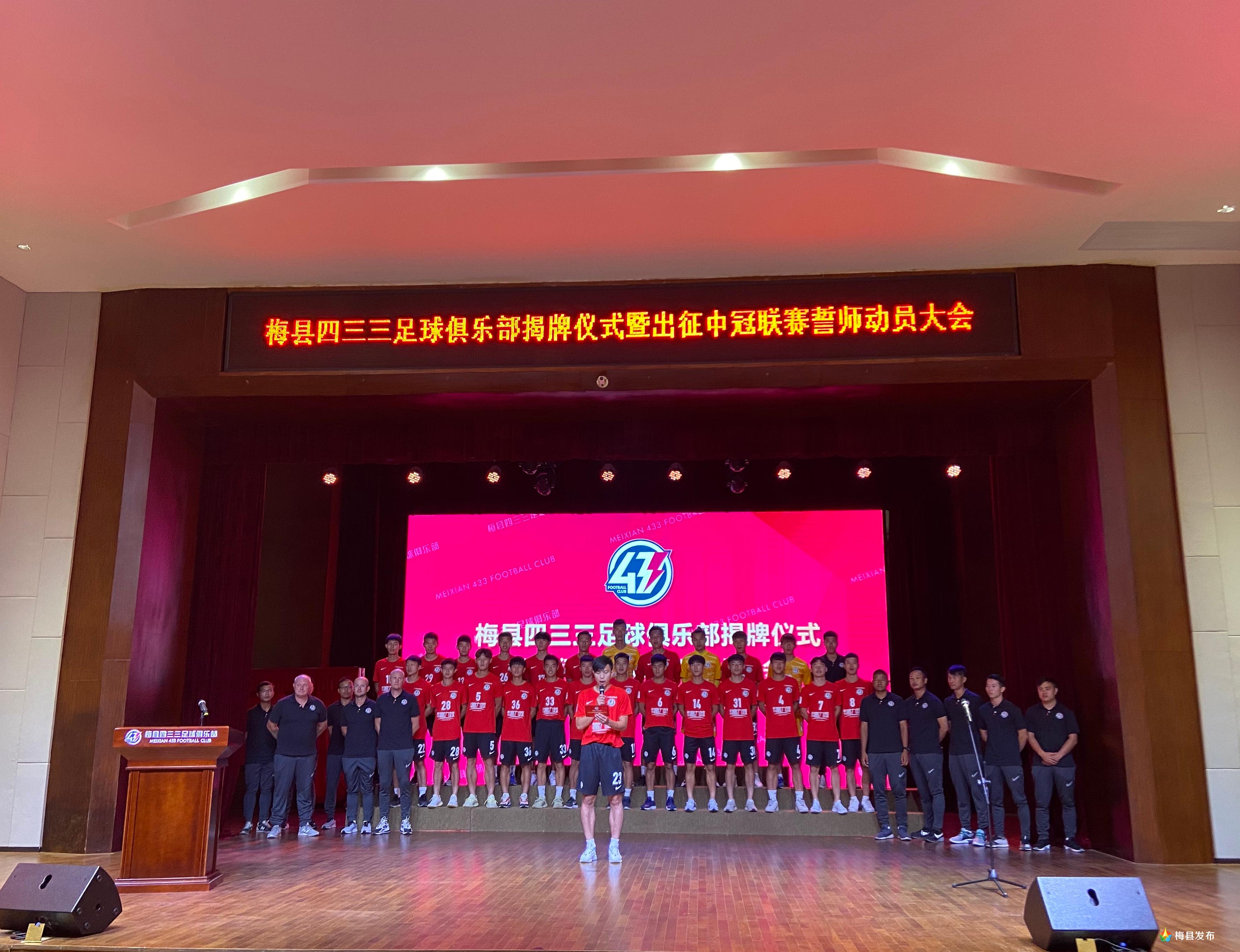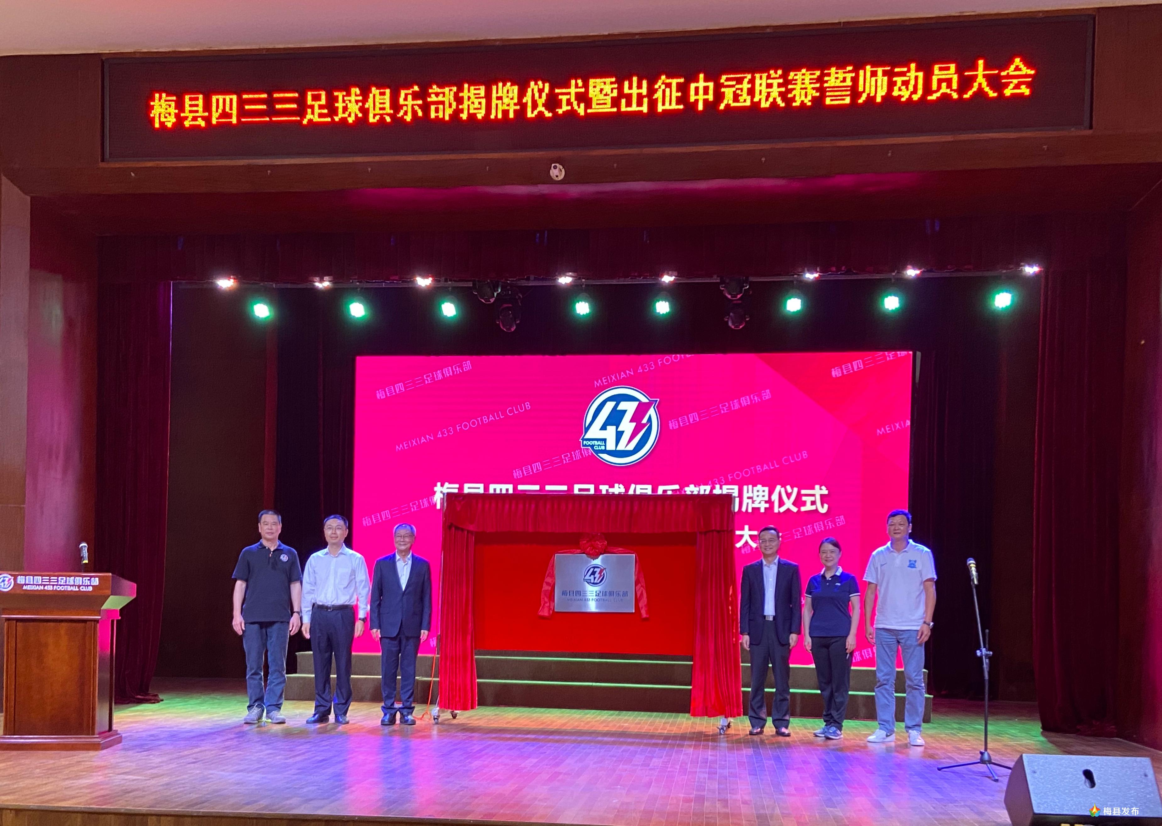 今天下午, 梅县四三三足球俱乐部在我区揭牌成立,并誓师出征中冠联赛。广东省足协主席叶细权出席活动;中国足协执委、梅州市市长张爱军为球队出征授旗。
