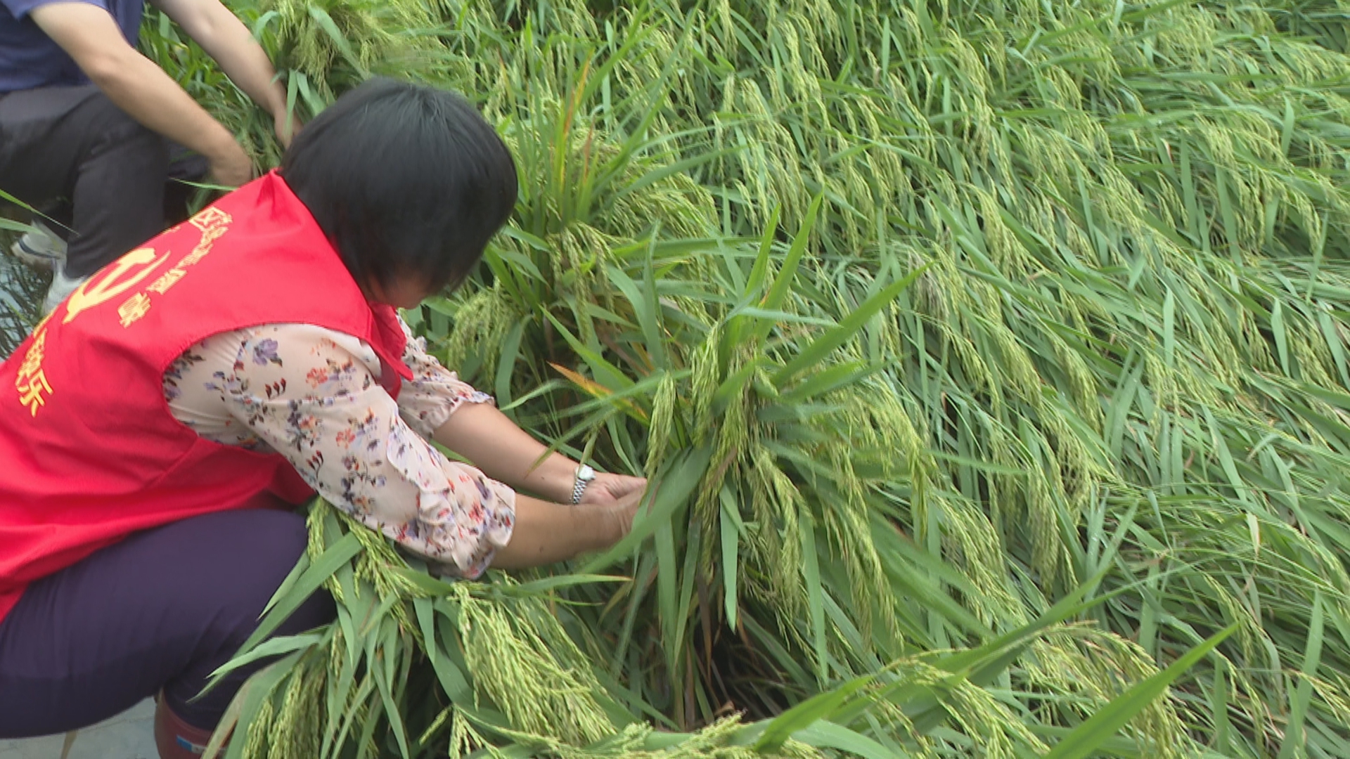 另一边,东洲村的一水稻种植基地,记者在现场见到水稻出现了部分面积的倒伏,村干部和农技人员正加紧把倒伏的水稻扶正,力争将损失降到最低。“大约有80亩左右,各种农作物受浸,包括水稻和玉米,还有柚子树。现在灾后水抽干净了,也叫了技术人员对农户作一些现场的技术指导,疏通水渠,排污水,把倒下的水稻扶起来做好复产。”雁洋镇东洲村党支部书记余大华告诉记者。