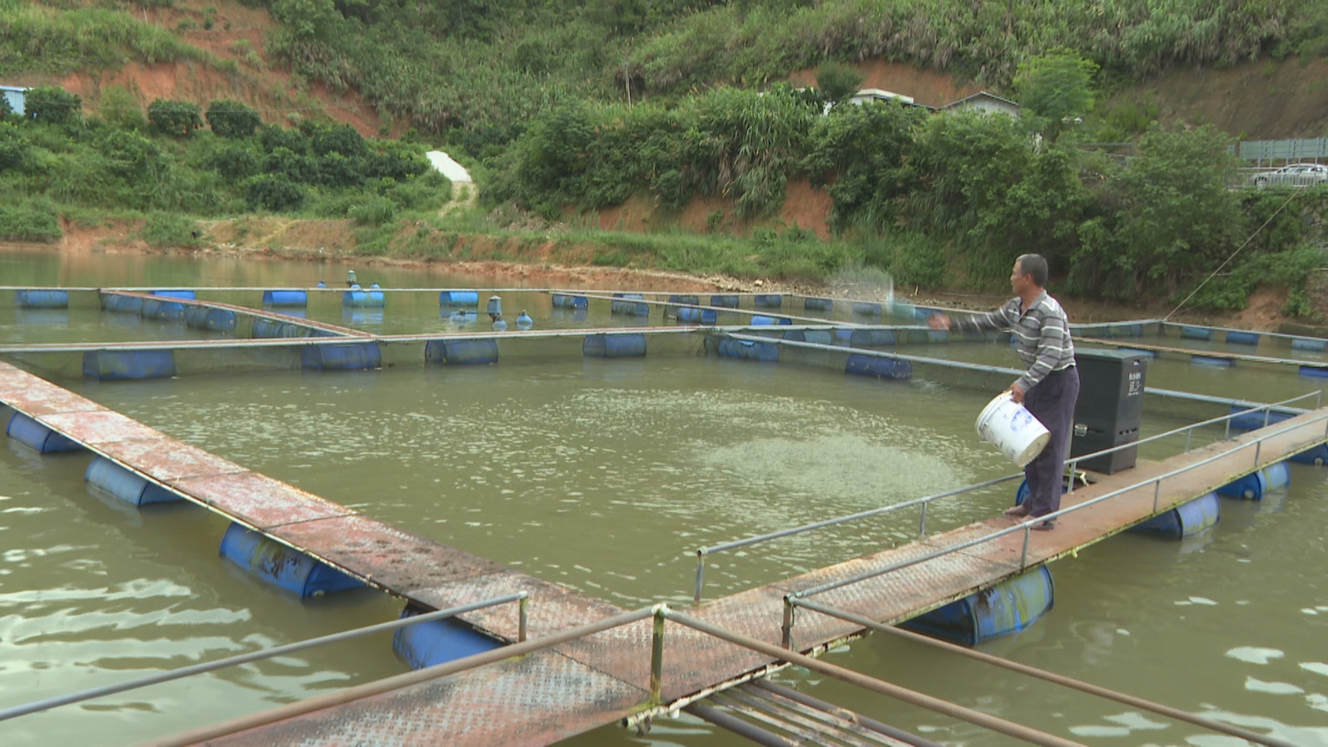 养殖户李宝华:“像我们这个水库都冲走了有五六万斤的鱼,大概直接损失50万元以上。现在暴雨停了,我们在渔业专业技术人员的指导下,对我们整个养殖基地水体进行消毒杀菌,让鱼能健康成长。”
