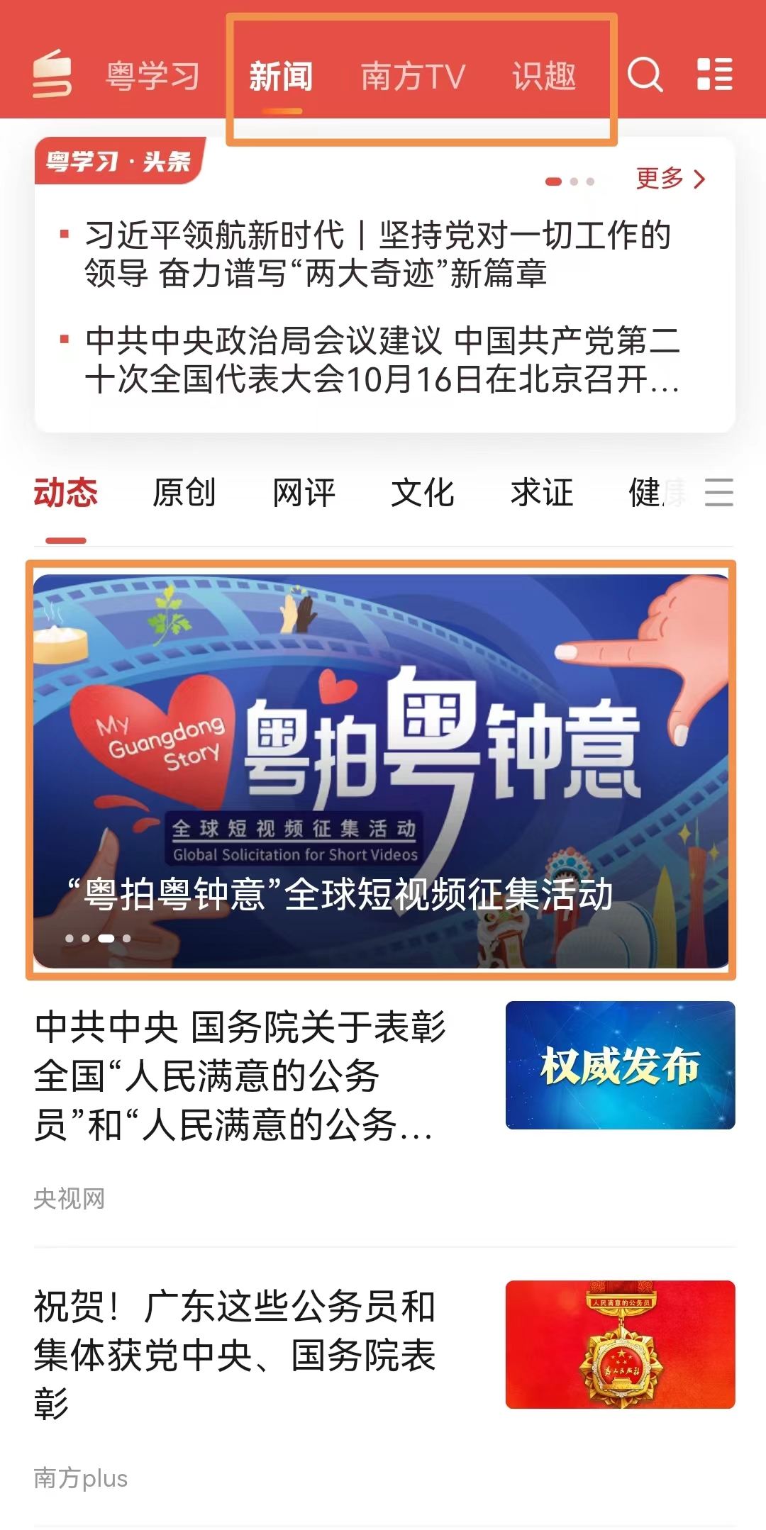 ②菜单栏选择“新闻”“南方TV”“识趣”