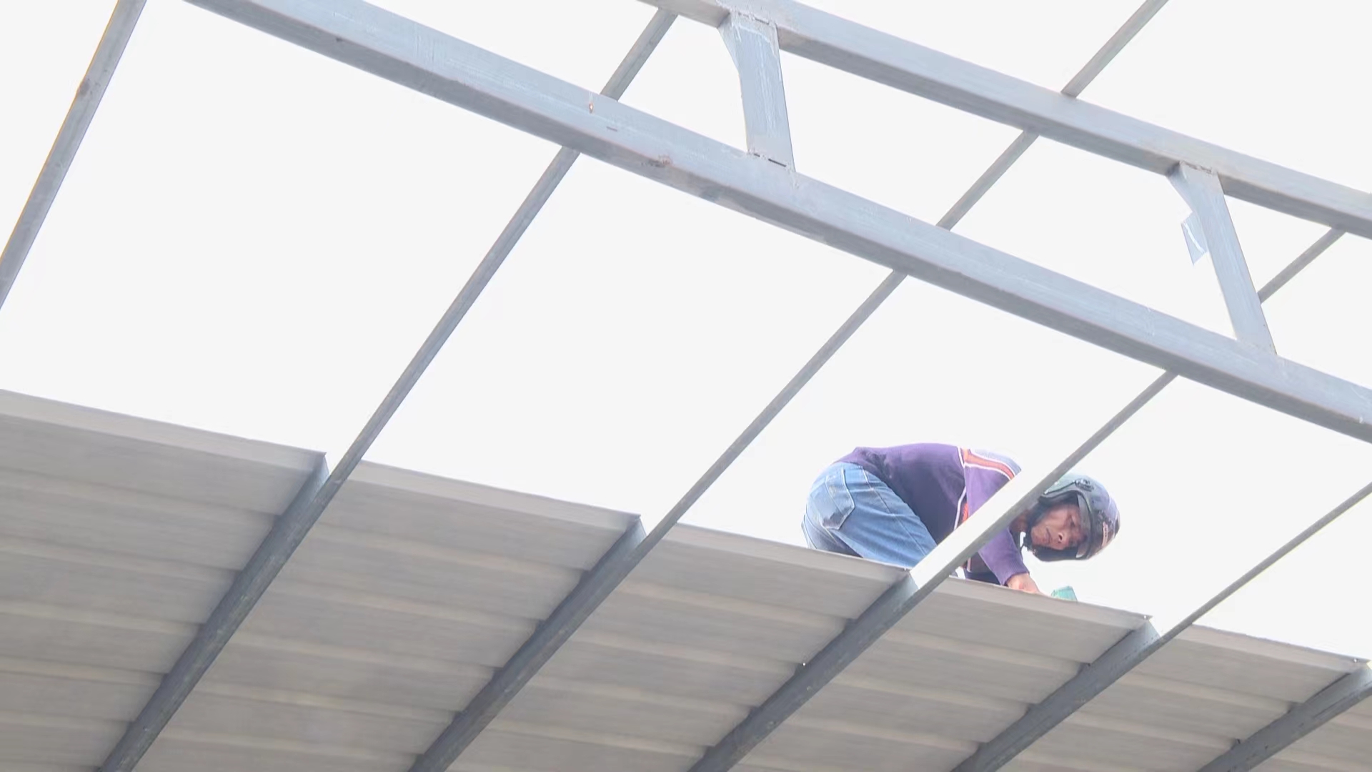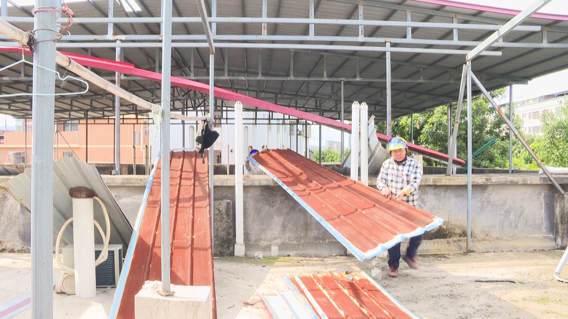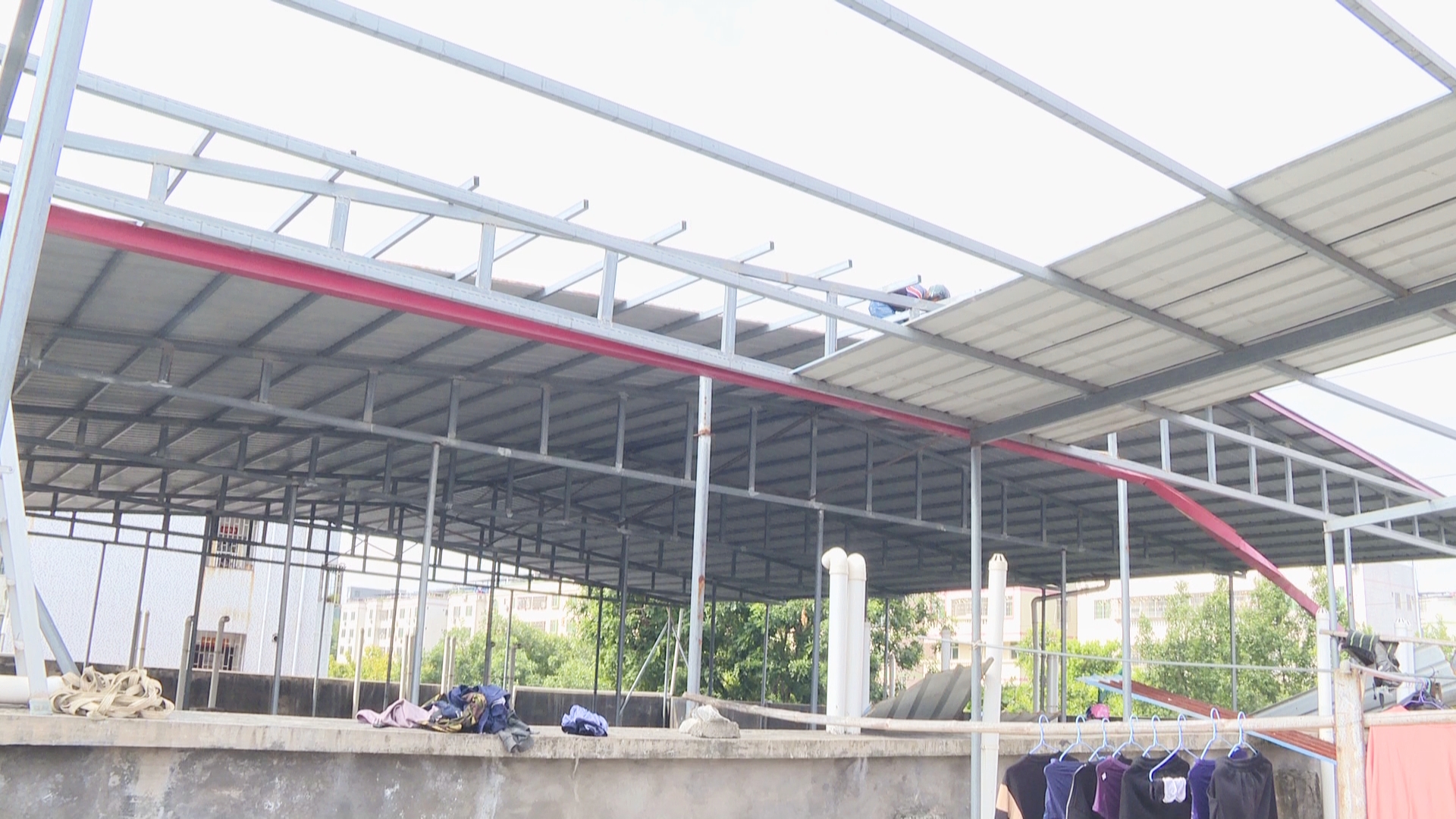 在程江镇岗子上的一栋居民楼顶,可以看到2个铁皮瓦棚已经锈迹斑斑,工作人员正戴着头盔,用工具对这些铁皮瓦进行拆除。据了解,这处铁皮瓦棚占地约1000㎡,已经搭建有10多年,年久失修。该栋楼居民张姨也是积极响应政府动员、号召,支持拆除这些破旧的铁皮瓦。“我响应政府号召,旧的(铁皮瓦)拆除比较安全,我会重新考虑搭建光伏发电或陶瓷瓦。主要政府很好,有补助,我也支持。拆了比较安全、美观,不然很破烂了风一吹也不安全。”